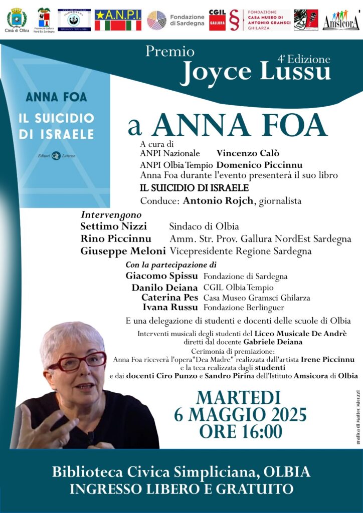 La Quarta edizione del Premio Joyce Lussu si svolgerà a Olbia il 6 maggio alle ore 16:00 nella sede della Biblioteca Civica Simpliciana. L’evento, a cura dell’ANPI Nazionale e dell’ANPI Olbia Tempio, vedrà la partecipazione della premiata storica e saggista Anna Foa, che presenterà il suo nuovo libro Il suicidio di Israele, edito da Laterza. […]