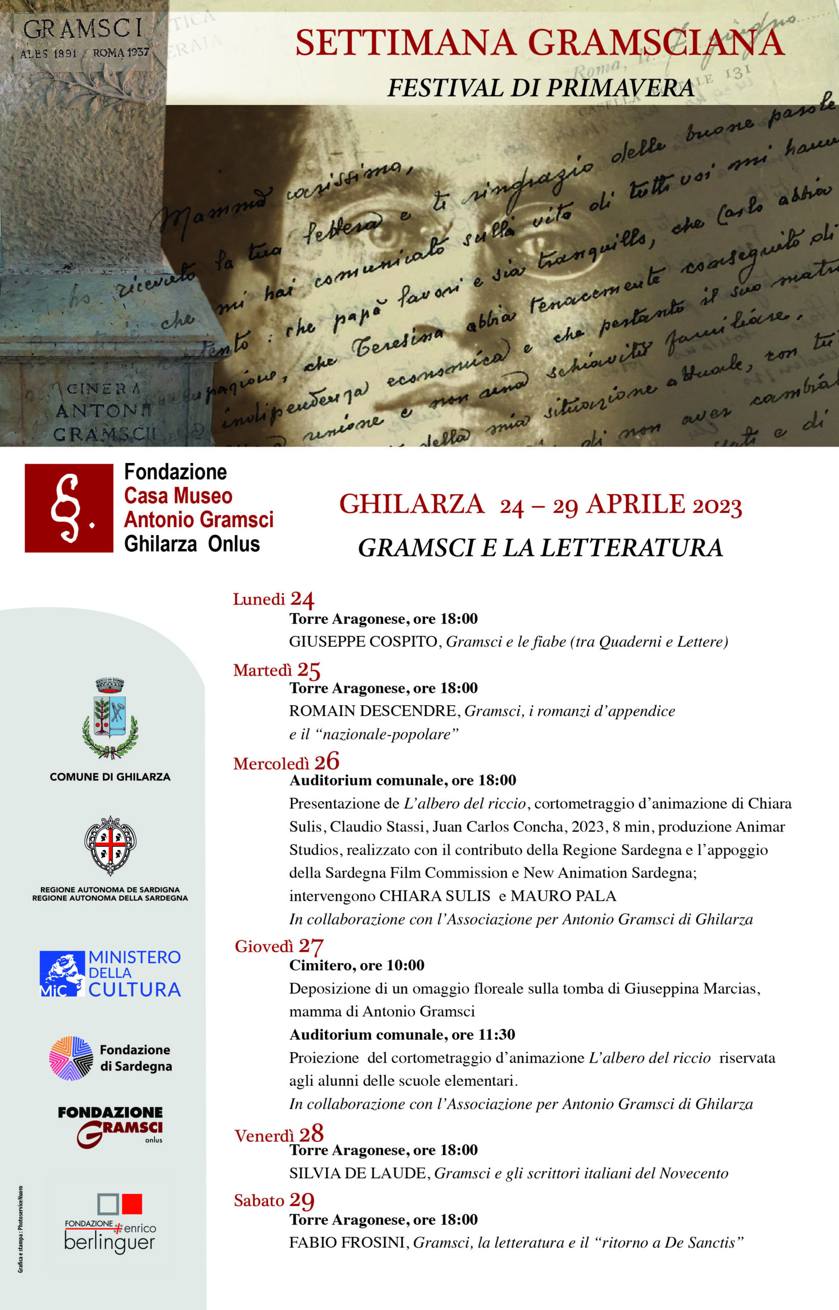 Inoltre, mercoledì 26 aprile, nell’Auditorium comunale vi sarà la presentazione del cortometraggio d’animazione L’albero del riccio, di Chiara Sulis, Claudio Stassi, Juan Carlos Concha, produzione Animar Studios, realizzato con il contributo della Regione Sardegna e l’appoggio della Sardegna Film Commission e New Animation Sardegna. Il cortometraggio si basa su un racconto contenuto nella famosa lettera di Gramsci al figlio Delio, del 22 febbraio 1932. Interverranno la regista Chiara Sulis e il prof. Mauro Pala (Università di Cagliari). Questa iniziativa si tiene con la collaborazione dell’Associazione per Antonio Gramsci di Ghilarza.