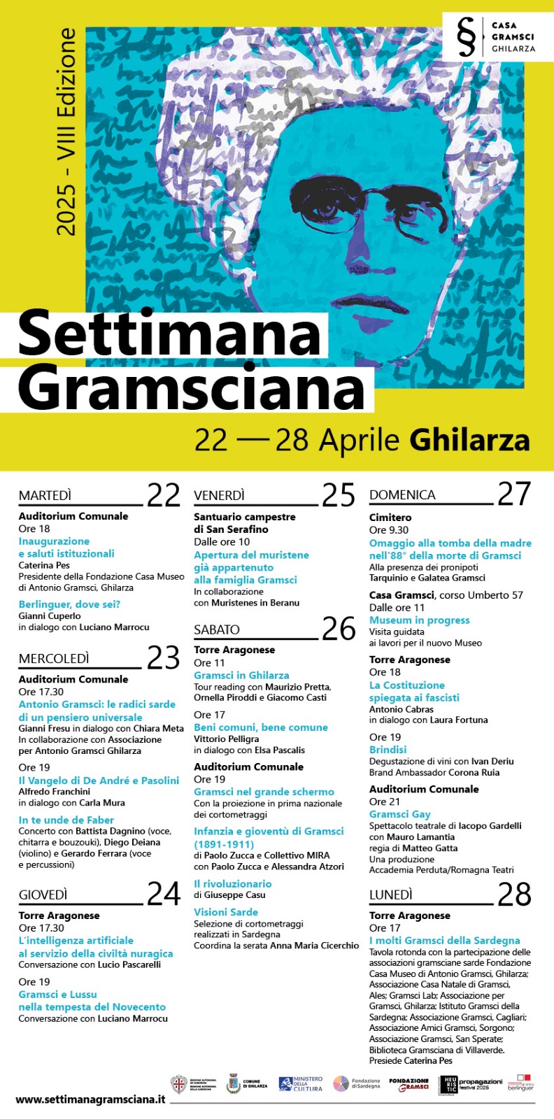 A trattare il tema dei beni comuni sarà l’economista Vittorio Pelligra mentre l’esperto di comunicazione Lucio Pascarelli terrà una conferenza sull’intelligenza artificiale e la civiltà nuragica. Ci sarà spazio anche per il fumetto con il libro di Antonio Cabras “La Costituzione spiegata ai fascisti” e per “Gramsci in Ghilarza”, un tour guidato nei luoghi gramsciani con Maurizio Pretta, Ornella Piroddi e Giacomo Casti. La Settimana Gramsciana si chiuderà poi con una tavola rotonda dal titolo “I molti Gramsci della Sardegna” in cui interverranno i rappresentanti di tutte le organizzazioni e associazioni che si richiamano al filosofo e politico sardo.